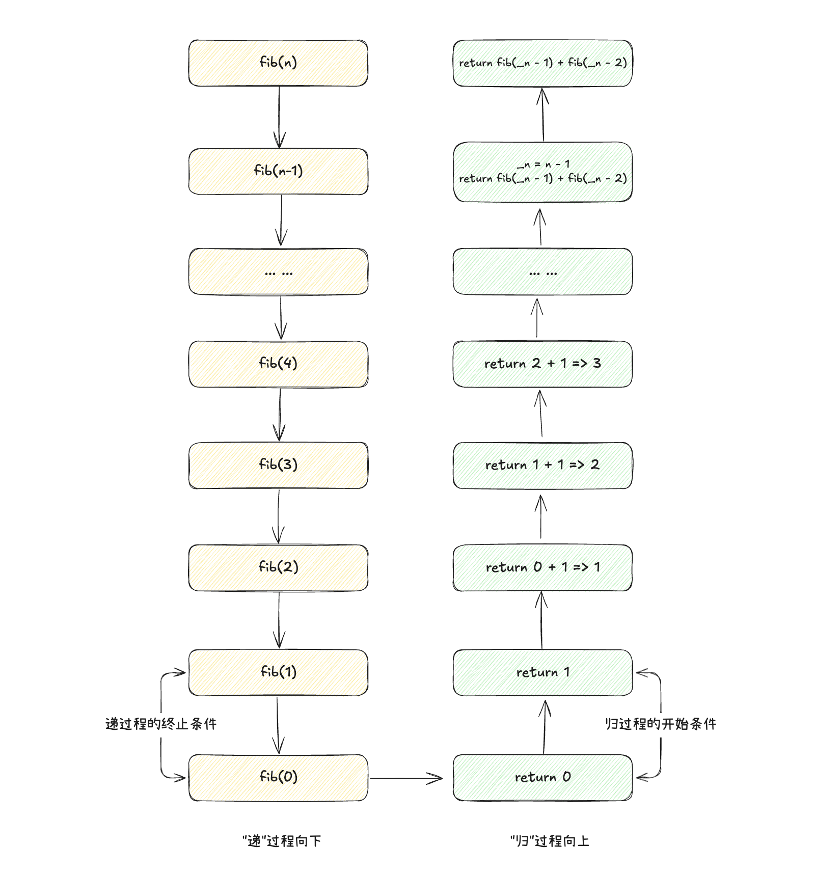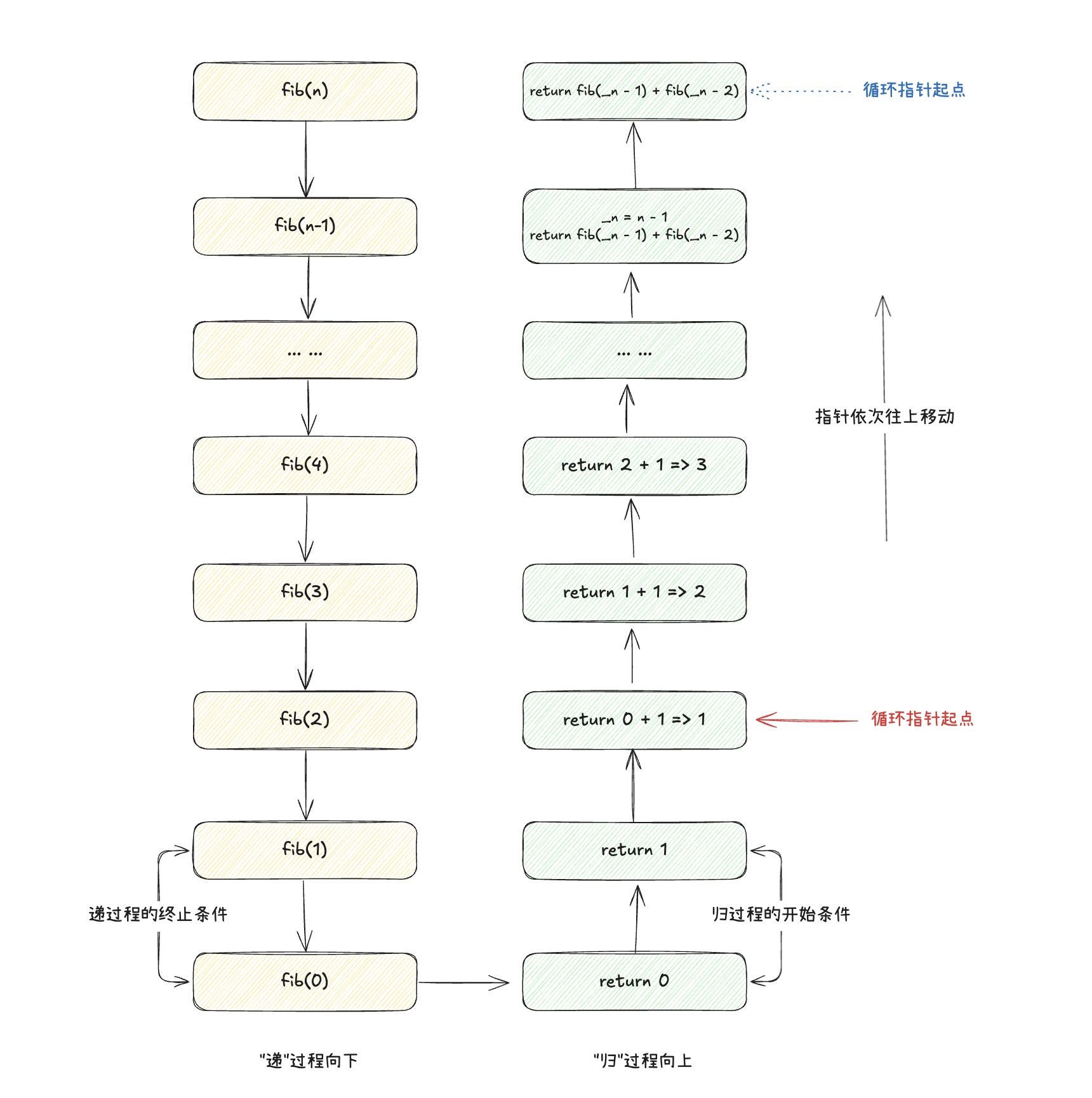 从解题思路上来说,迭代是在递归思维的归 过程上,利用循环来不断更新迭代值,从而得到最终结果。如下图所示
