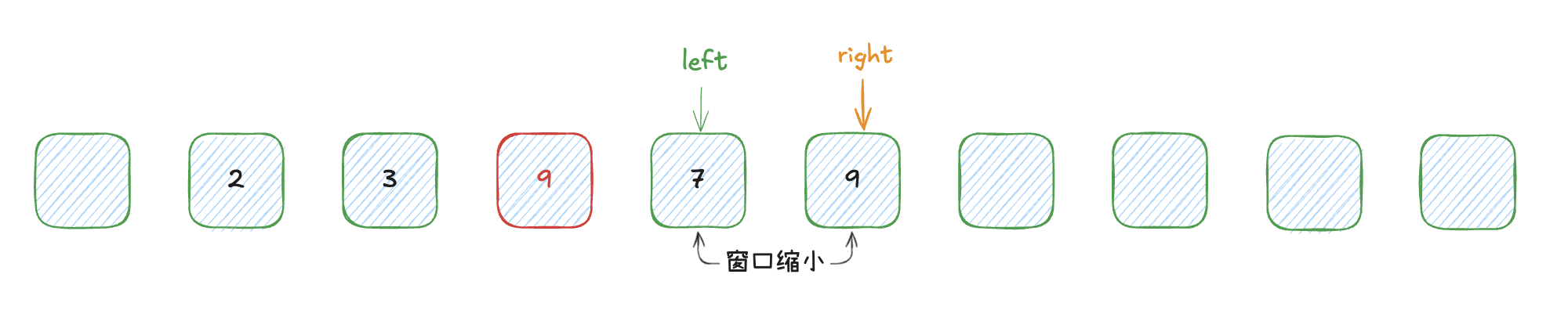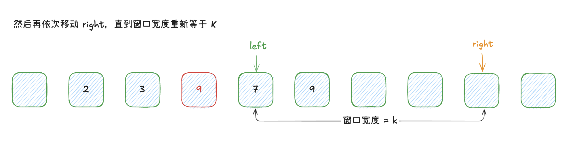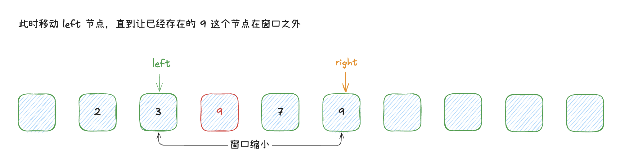 一个比较巧妙的思路,就是移动左边界 到重复元素的下一个位置,让其不再参与计算。我们用图示来表达这个思路