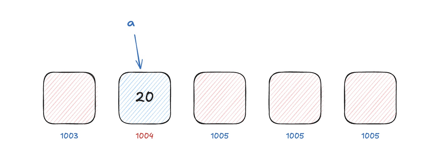如下代码所示,我们声明了一个变量 a,它的值是 20。对应的内存示意图如下所示