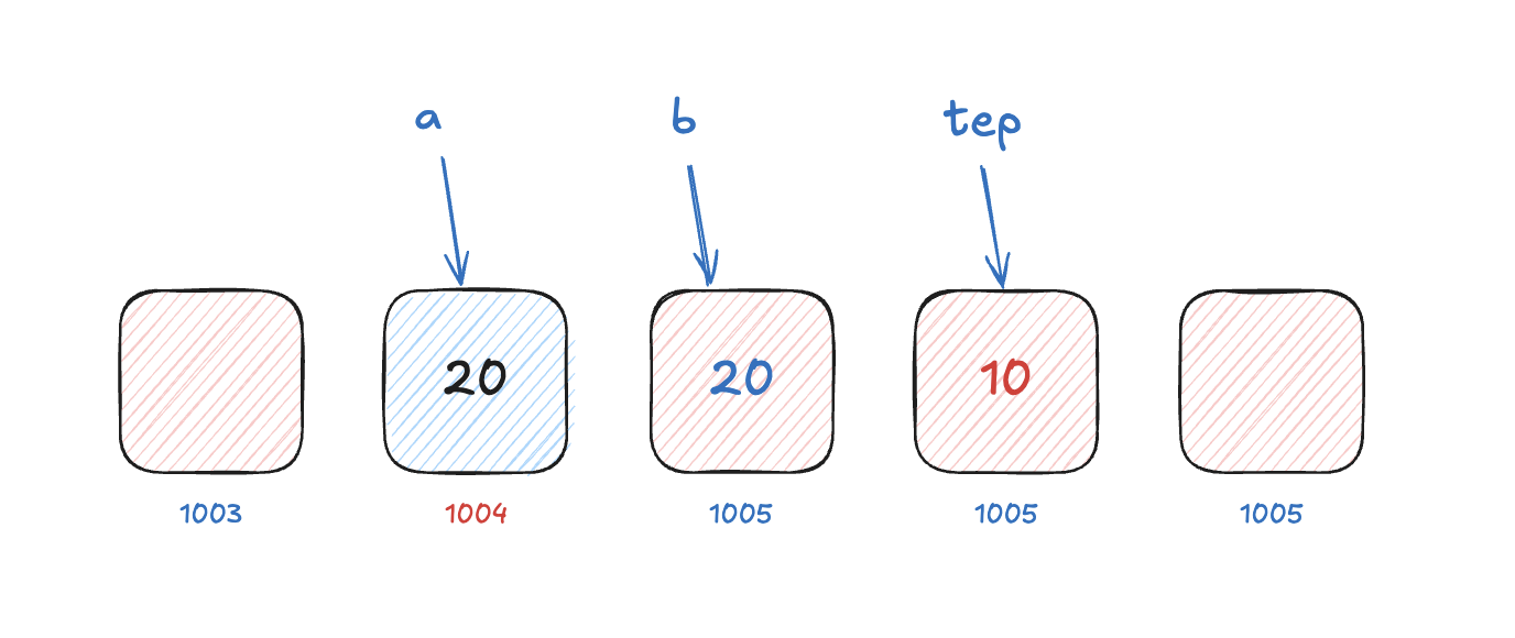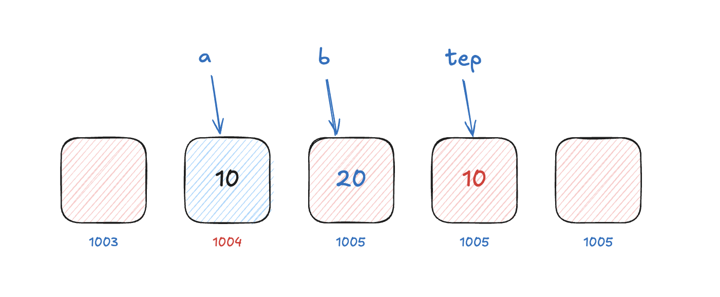 置换的思路就是通过一个临时变量来存储其中一个变量的值,然后再将另外一个变量的值赋值给第一个变量,最后再将临时变量的值赋值给第二个变量。内存中的表现如下所示